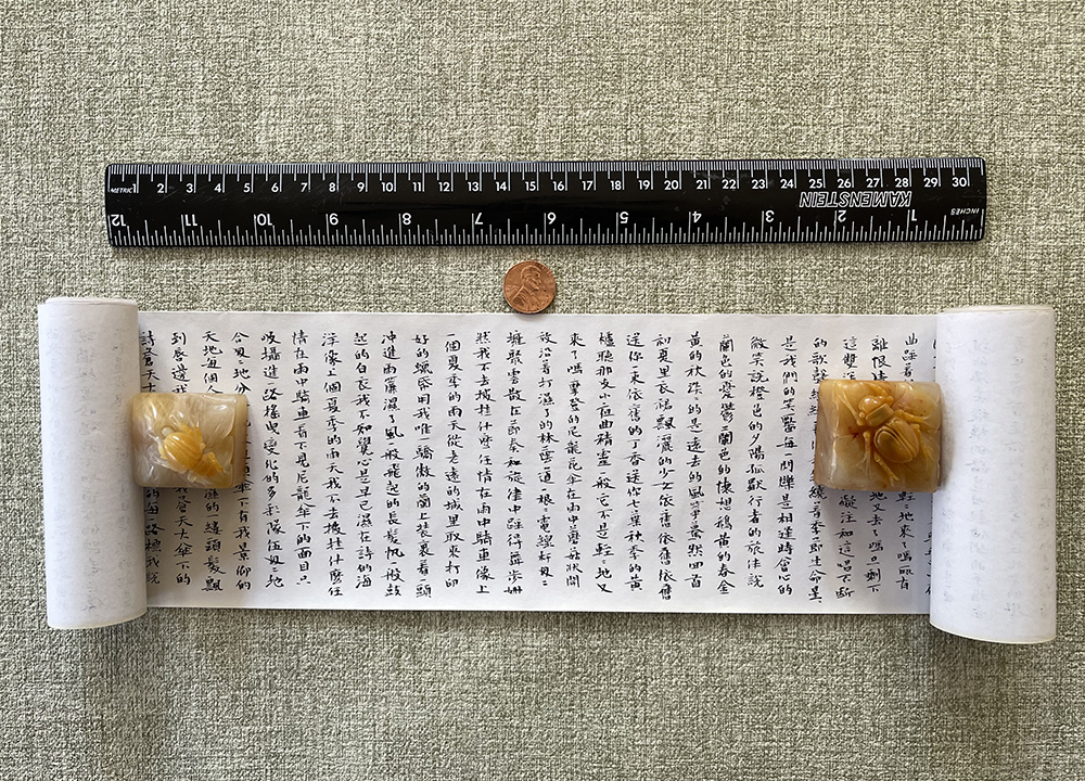 袖珍书法卷:古丽蓉诗十八首 2025年11月23日 不算落款3097字微楷长卷,长约225厘米,宽约10厘米。字约5毫米大小。 (1) (2) 点击下面箭头播放全幅长卷视频(1分30秒) Your browser does not support the video tag.