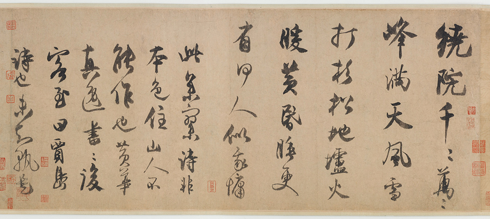 李山这幅画和同时期的北宋名家李成的画法相似,笔墨苍劲,气象萧疏。画后面是金朝名画家王庭筠的题诗,王庭筠儿子王万庆的题跋;接下来是明代大文豪王世贞和文征明侄子文伯仁的题跋;再接下来是乾隆殿试探花王文治的题跋。全卷请看下面的视频。