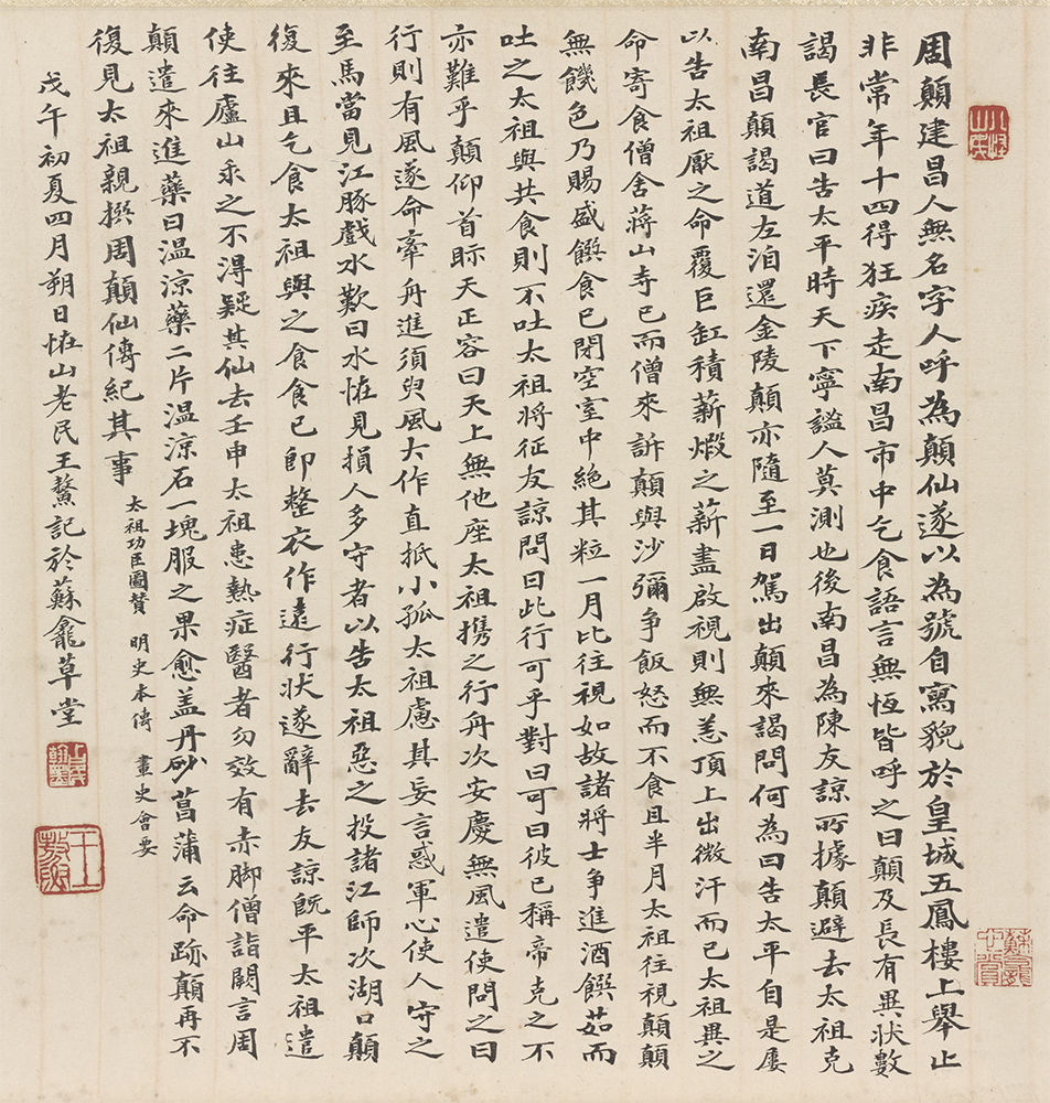 这幅画作者署名“颠仙”,后面的跋是署名“王鳌”书写抄录的《明史·列传》中的一部分,讲的是一个名叫周颠的人的故事,见图(5)。顺便说下,这个王鳌不是明代那个大文学家、户部尚书、武英殿大学士王鳌,而是晚清的西泠印社早期社员王瞻民,也姓王名鳌。