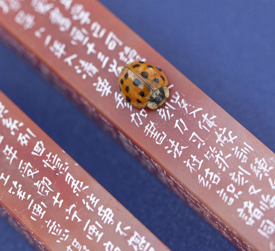 为自己刻了两个1厘米见方的小图章,边款的字大约2毫米,比米粒小得多。印石是老挝红花石,又漂亮又好刻。
