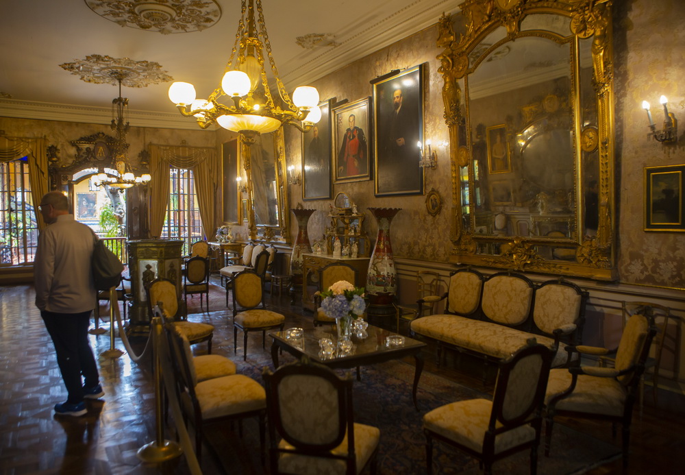 供游客参观的空间只限于二楼的一些房间,众多的房间,家具古典装饰精美,而房屋中间颇具西班牙风格的明黄色墙壁和红木栏柱环绕的天井里古木参天,特别悠然雅致。据说房屋现任主人仍然在第一层居住,我们导游说这位伯爵有时还会跑上来,随机和游人交流。不过我们没有碰到他,只看到桌上一张张他女王一般气势的母亲与珠光宝气亲属们的聚会合影,墙上他先人父辈们的画像,还有一幅伯爵本人的巨幅油面,画面里他的祖国西班牙培种的猎犬忠实地陪伴在旁。