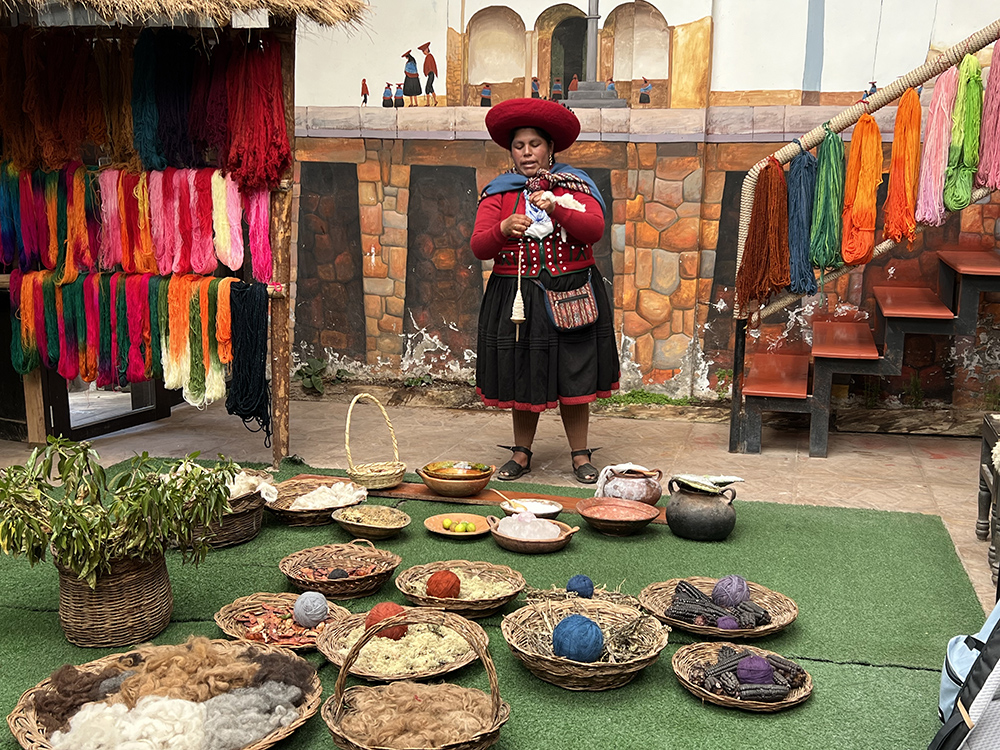 参观钦切罗(Chinchero)镇,尽管在摧毁的印加皇宫基础上矗立着西班牙殖民者建的秘鲁最早之一的天主教堂,但扑面而来仍然处处可见典型的印加元素:巨大的石墙,一层一层的农业梯田;居民仍然保留着从印加时代传承下来的手工艺传统,他们用各种植物给衣料染不同的颜色,用骨制梭子手工织布,穿戴鲜明特别的衣帽,说着西班牙人不可理解的祖传语言,他们像一尊化石,让人透过时间看到过去。
