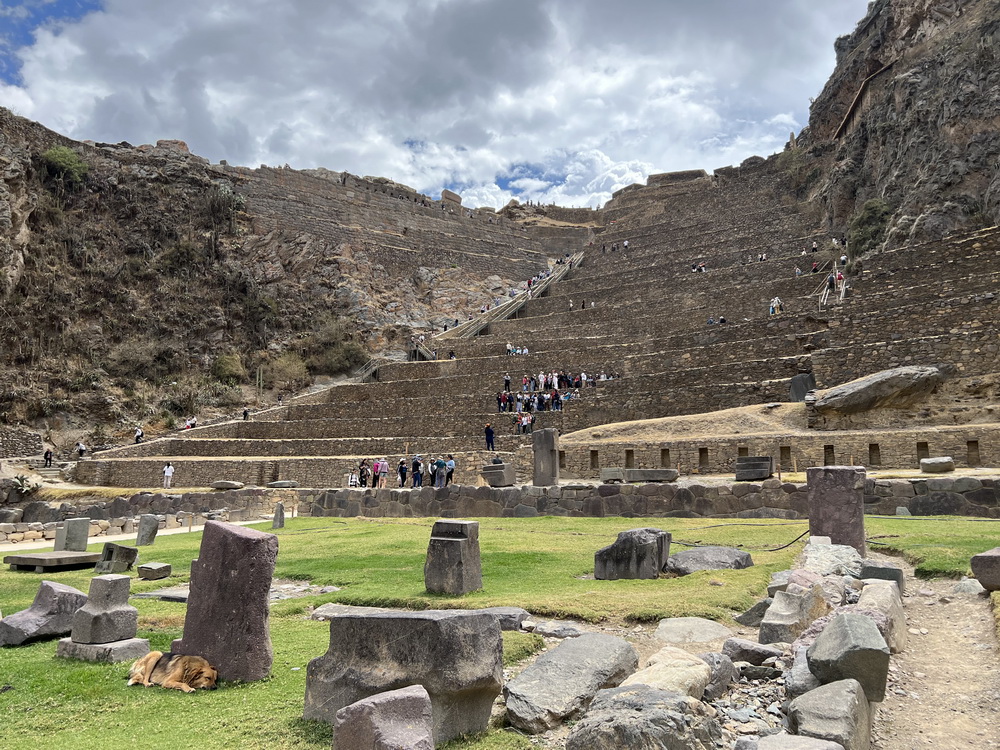 马丘比丘每天限制只让约5000游人进入,同时它提供三条不同的步行游览路线以减少拥挤。我们持有早上10点钟的门票,排在大长队的最前面,按时进门后顺着最受欢迎的2号路线游览。这条路线先是顺着石头台阶一段段爬上可以俯瞰马丘比丘城的高峰,然后下行进入马丘比丘城里游览,再继续下行走过散养着羊驼的绿色草茵,最后观赏一块巨大的模仿着远处山峰形状切成的石碑。
