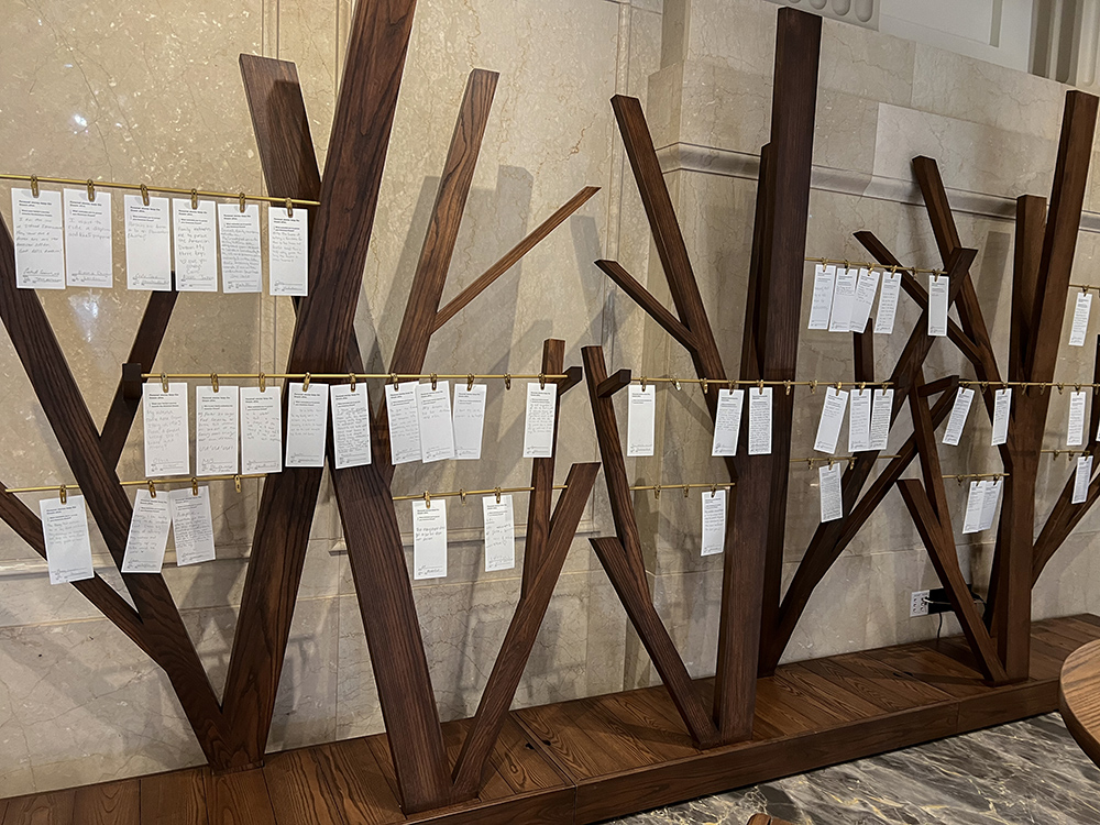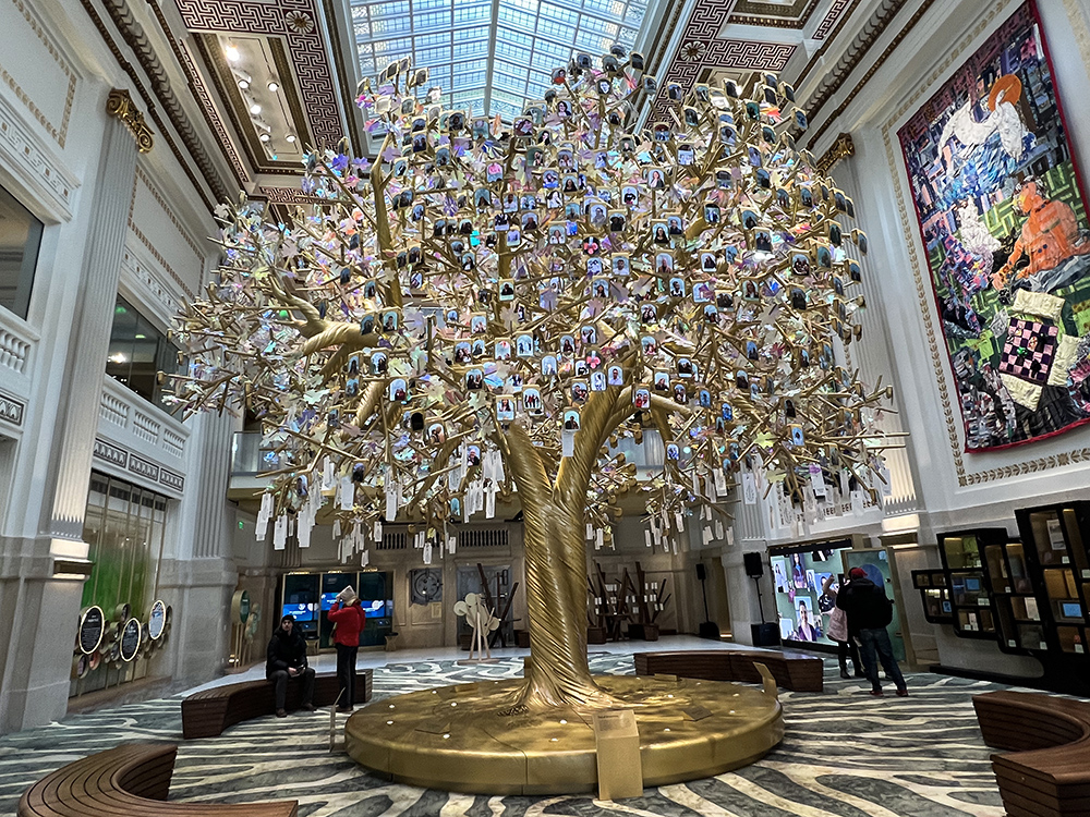博物馆座落在首都的中心地带,在美国财政部大楼北边的街角,也算是紧挨着总统府白宫了。一进门,便见开阔的中庭里有一棵立在敦实金色底座上二层楼高金色的树雕,树下巨型地毯的图案如同向外茁壮延伸的大树树根,金色树上则繁茂生长着一千片数字“树叶”,每一片树叶是一个来访者个人或家庭的照片和故事,他们叙述的美国梦。