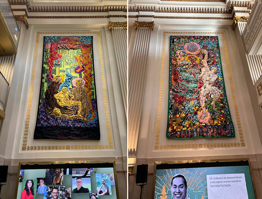 博物馆一楼大厅右边墙上挂着三幅艺术家巴兹尔•金凯德(Basil Kincaid)创作的彩色拼布挂件,22英尺高的巨型作品分别展示过去、现在、将来三个主题。随着讲解员的提示,我们看见代表过去的画面里人们从大地开始往上攀援,意喻人类的进化,其中一个人似乎踩在另一人的肩头,像是在诠释牛顿的一句话 “如果我看的更远,那是因为我站在巨人的肩膀上”,象征着一代一代人的传承和托举;中间作品代表现在,它展示一个户外轻松愉快的画面,宠物狗和猫与人相伴,白鸟优雅地展翅飞翔……最靠前的内容是一个棋盘,一个掷出来的骰子,好像是强调人生的随机和难以预测,给平和的画面带来一种悬念的张力;最右边代表将来的作品,仍然是人尽力向上奔赴和举托,朝向星空,朝向月亮,未来目标熠熠生辉晶莹闪亮。