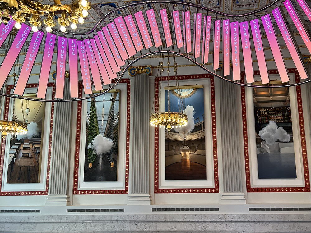 梦想大厅的一面墙上是荷兰艺术家伯恩德诺特•斯米尔德(Berndnaut Smilde)特意为博物馆创作的雨云摄影系统作品,每幅都漂着他以独特方式产生的云朵,四幅作品覆盖整个墙面,代表博物馆强调的实现美国梦的四大支柱:在马里兰州早期曾经给黑人授课的教室拍摄的照片对应着教育, 在德克萨斯州新型立式农场拍摄的照片对应着创新,宾夕法尼亚医院手术教学室的照片对应着健康,芝加哥跳动着各种数字的旧交易所照片对应着金融。