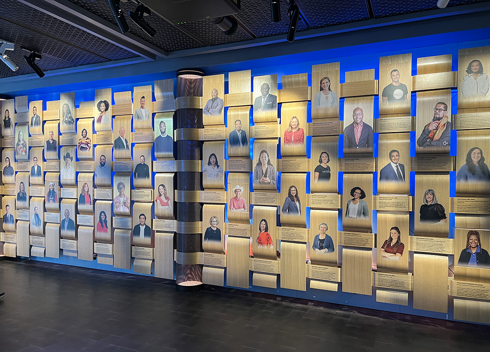 底层展厅叫做“梦想的基石”展厅,这儿用更多的内容和高科技互动平台展示博物馆美国梦想四大主题:教育、健康、金融和创业。人工智能全息投影可能算是挺引人注目的一项,屏幕上栩栩如生的一些知名人物比如塞里娜•威廉姆斯(Serena Williams)可以和你交谈,回答你提出的问题,甚至建议让你和他们玩自拍。旁边墙上名为“梦想挂毯(Tapestry of Dreams)的展厅,一百名具备美国坚韧不拔精神努力追求美国梦想的人,从屏幕上望向你,你走向他们,他们便开始讲述旨在感染或感动你的他们每个人的故事。