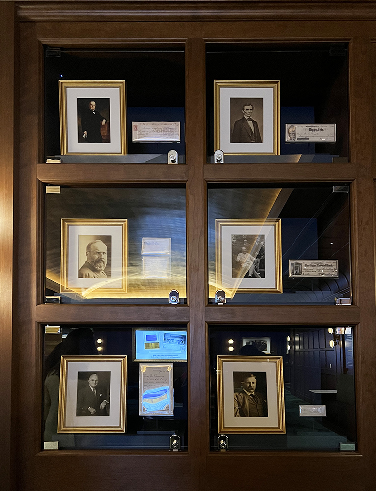 博物馆甚至有一些传统博物馆的内容:历史文物。因为博物馆楼的前身是华盛顿地区两个历史悠久的银行(Riggs Bank,American Security and Trust),在它们一百多年的历史中,美国联邦政府和华盛顿特区众多历史人物包括近乎半数的美国总统都是它们的客户,于是我们在展柜里看到不少有他们亲笔字迹的银行文件,包括有林肯签名的25美元支票原件,而博物馆地下室保留的原来的银行金库,巨大的金属门让人不禁驻足感叹,厚重的门,满满的历史感。