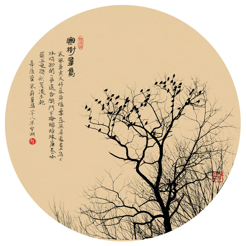 华翰墨影 【菩萨蛮】寒树群鸟图 把鼠标放图片上可局部放大 mouse over to zoom 【菩萨蛮】寒树群鸟图 寒风萧索天将暮, 黄栌叶落无寻处。 群鸟上林梢, 乡关一梦遥。 香阁门乍掩, 窗暗珠帘卷。 吟罢五更残, 彩笺泪未干。